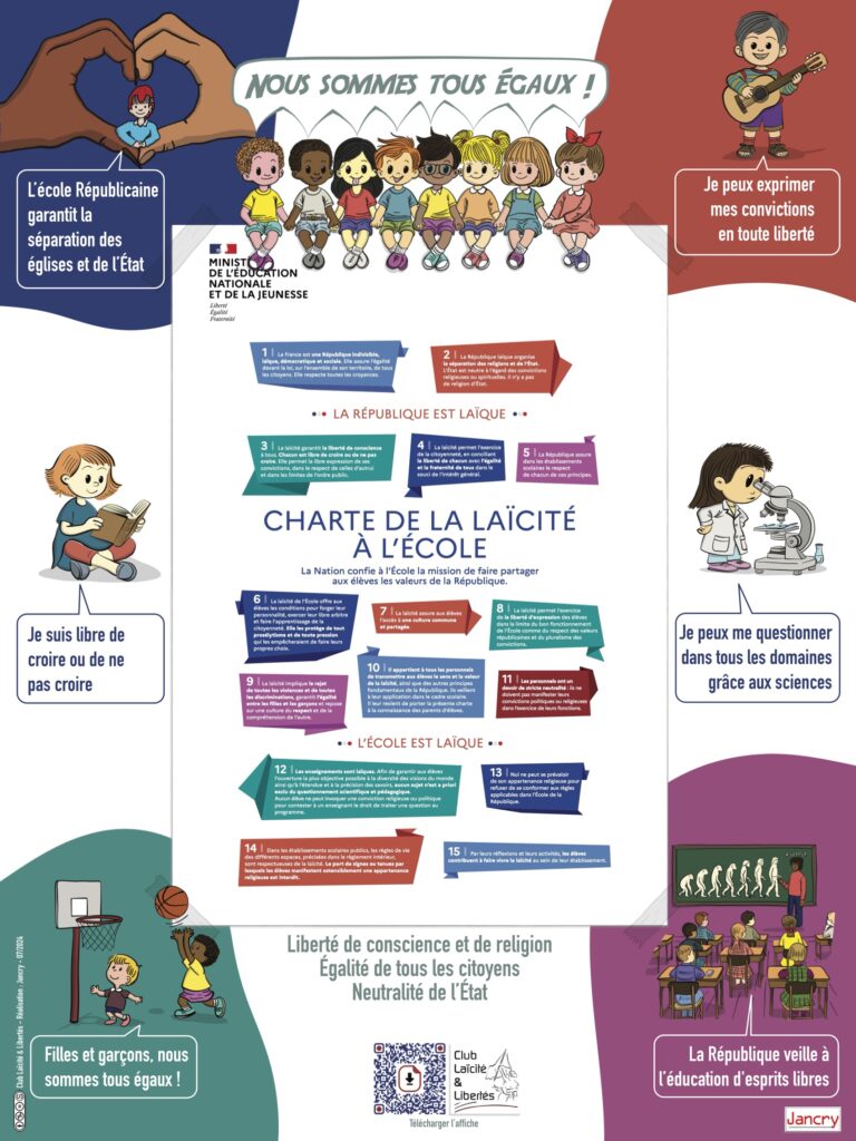 Avec l’Association RERS à Evry-Courcouronnes et le dessinateur Jancry, nous avons réalisé un poster sur la Charte de la laïcité pour le scolaire. Cette affiche est librement téléchargeable et utilisable sans modération sans modification ni usage commercial (sinon nous consulter).